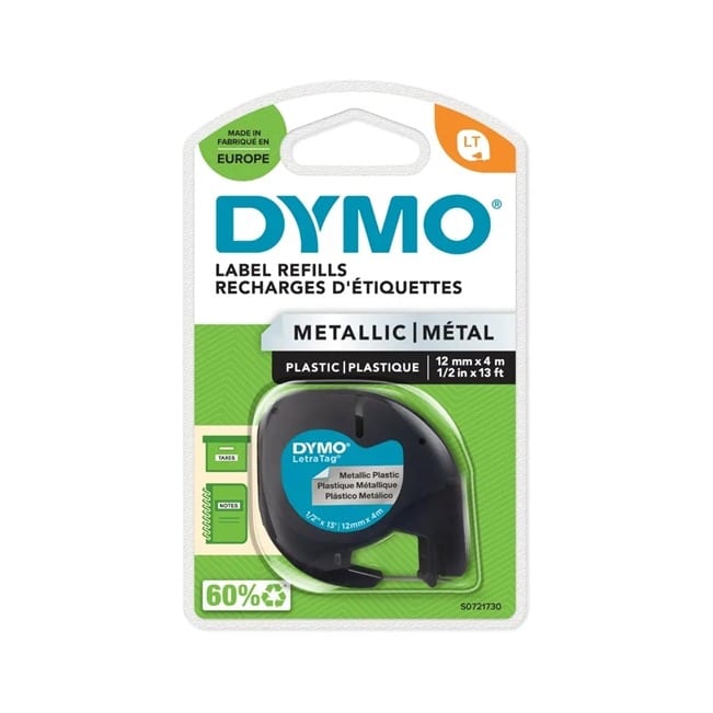 Dymo LetraTag Plasttape 91228 Sølv Metallic 12mm x 4m fra RE ApS. Kvalitetsprodukt til kontor, skole eller kreativt brug.