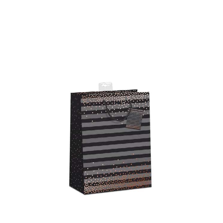Glædeligt overrasket! Kvaliteten på Gavepose til Flaske ” Sort Strib med Guldprikker” er i top. Bestiller igen uden tøven.