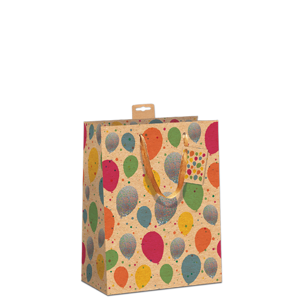 Papir 18X23Mm Til Forsendelse - produktbilledeGAVEPOSE STR. M ” BALLON HOLOGRAM TRYK I KRAFTPAPIR”18X23X10 CM