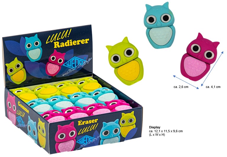 Viskelæder Til Forsendelse - produktbilledeVISKELÆDER – UGLE ” LULU” – ASS. FARVER – 24 STK PR. DISPLAY